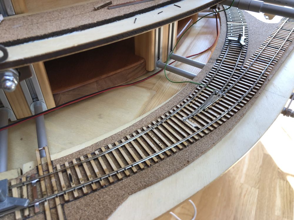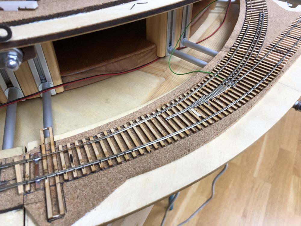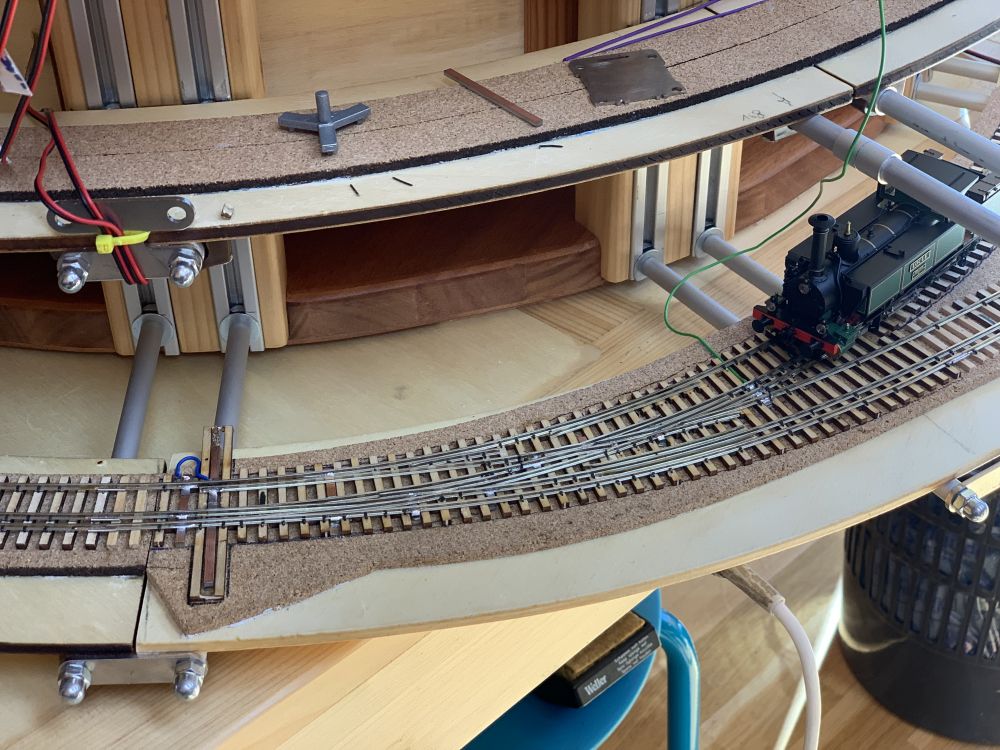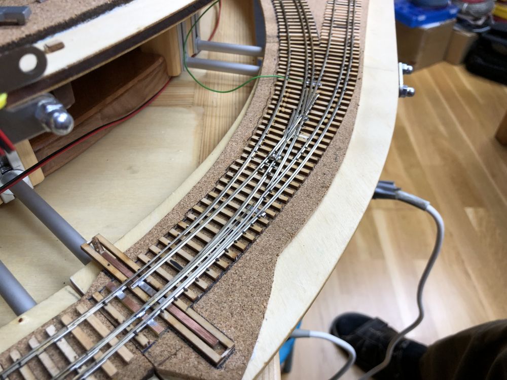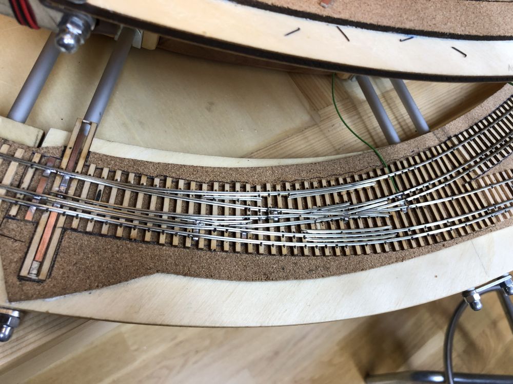 J’ai compris un détail important qui pose problème dans l’aiguillage en courbe, les axes fixes doivent passer de travers dans les courbes ! ... résultat, en fonction du diamètre des roues, les contres-rails doivent être décalés en conséquence et ne servent donc à rien pour les roues plus petites. Même problème dans la zone de croisement H0 et H0m.