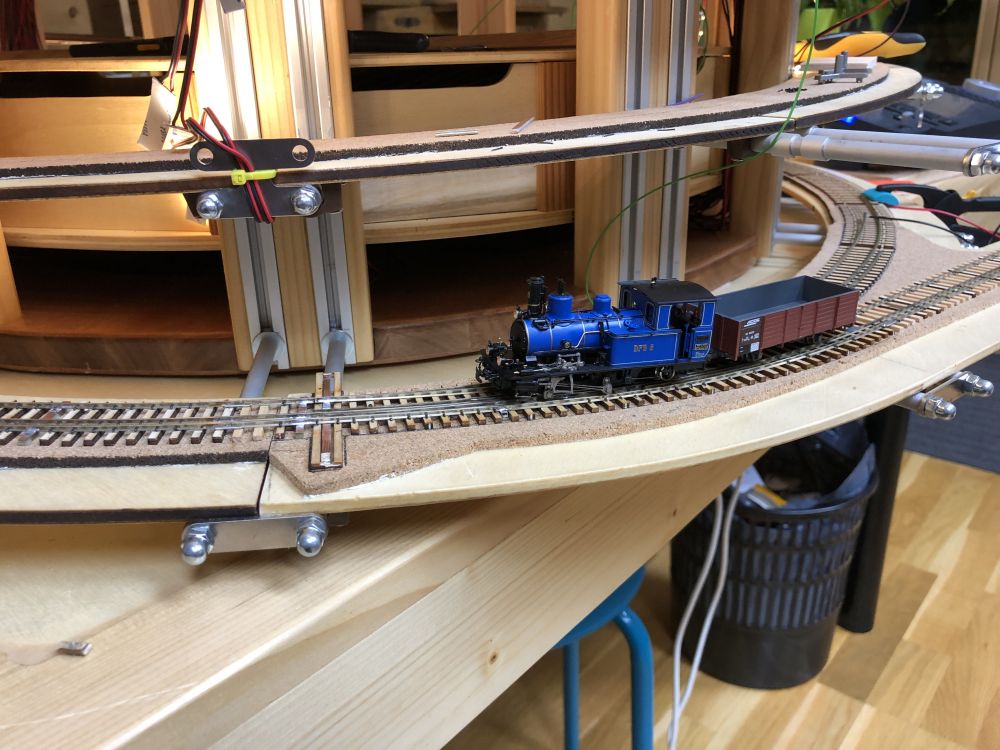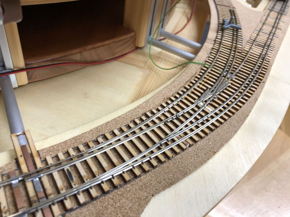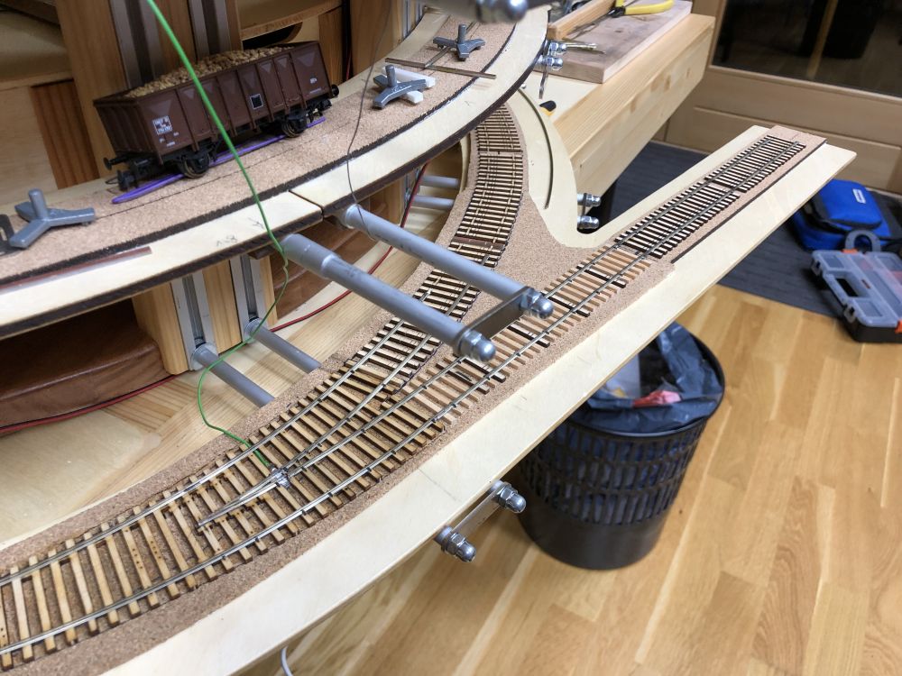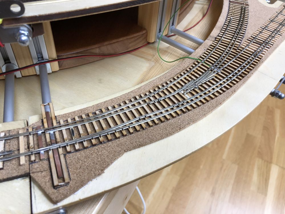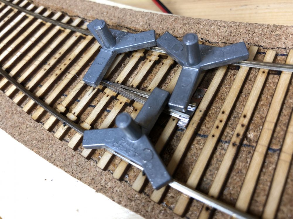 J’ai compris un détail important qui pose problème dans l’aiguillage en courbe, les axes fixes doivent passer de travers dans les courbes ! ... résultat, en fonction du diamètre des roues, les contres-rails doivent être décalés en conséquence et ne servent donc à rien pour les roues plus petites. Même problème dans la zone de croisement H0 et H0m.