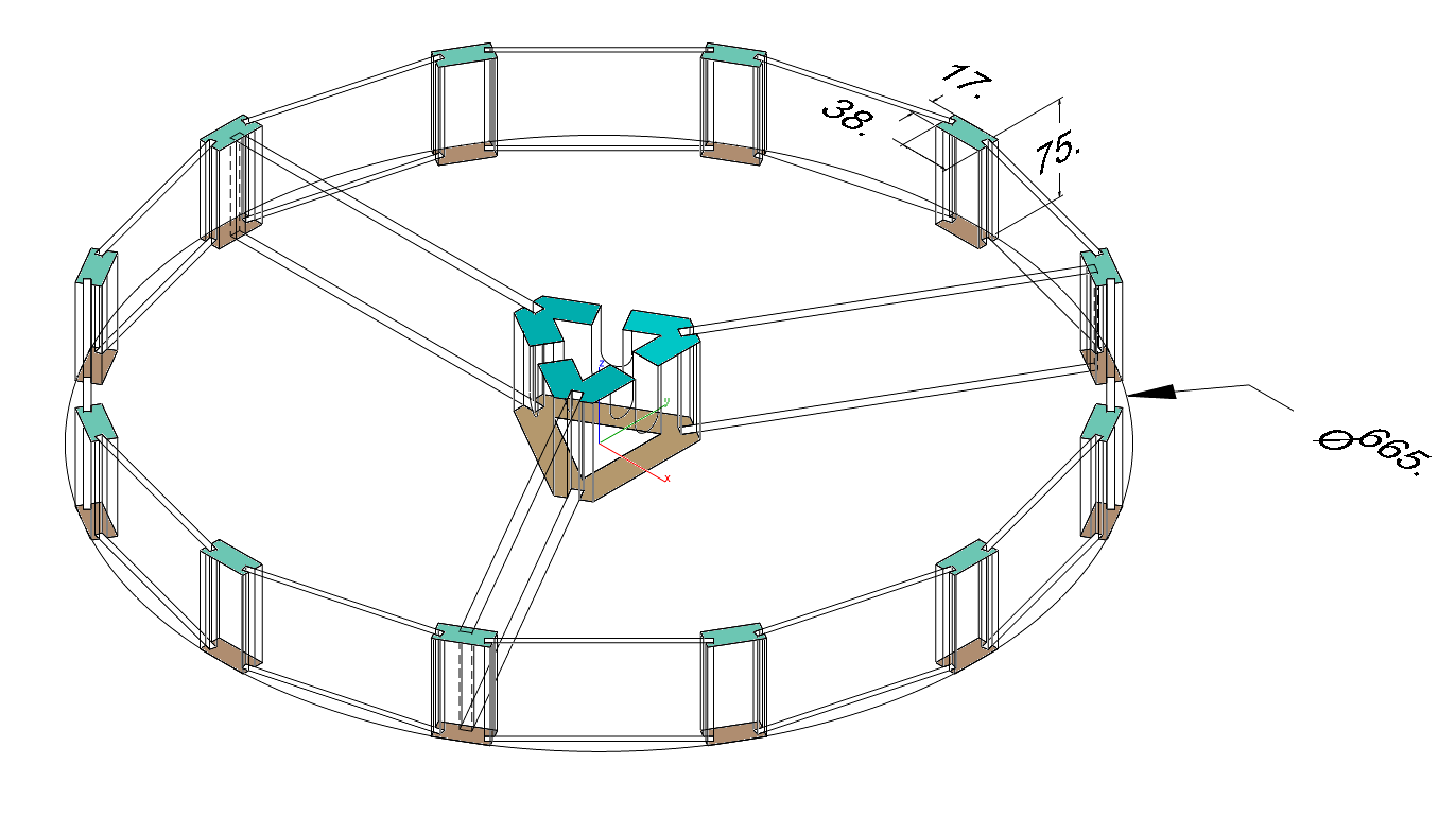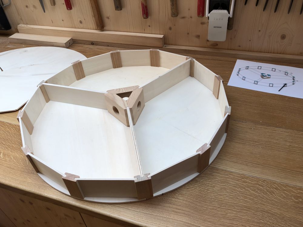 Avant de commencer le câblage, il faut faire un boitier à l'intérieur de l'hélicoïde. Voici le début du projet en bois pour ne pas dépareiller. La difficulté est de pouvoir le mettre dans l'hélicoïde en passant par les ouvertures en forme de secteurs triangulaires. Il faut donc trois éléments et l'assemblage doit se faire à l'intérieur. Le couvercle sera aussi en trois éléments.