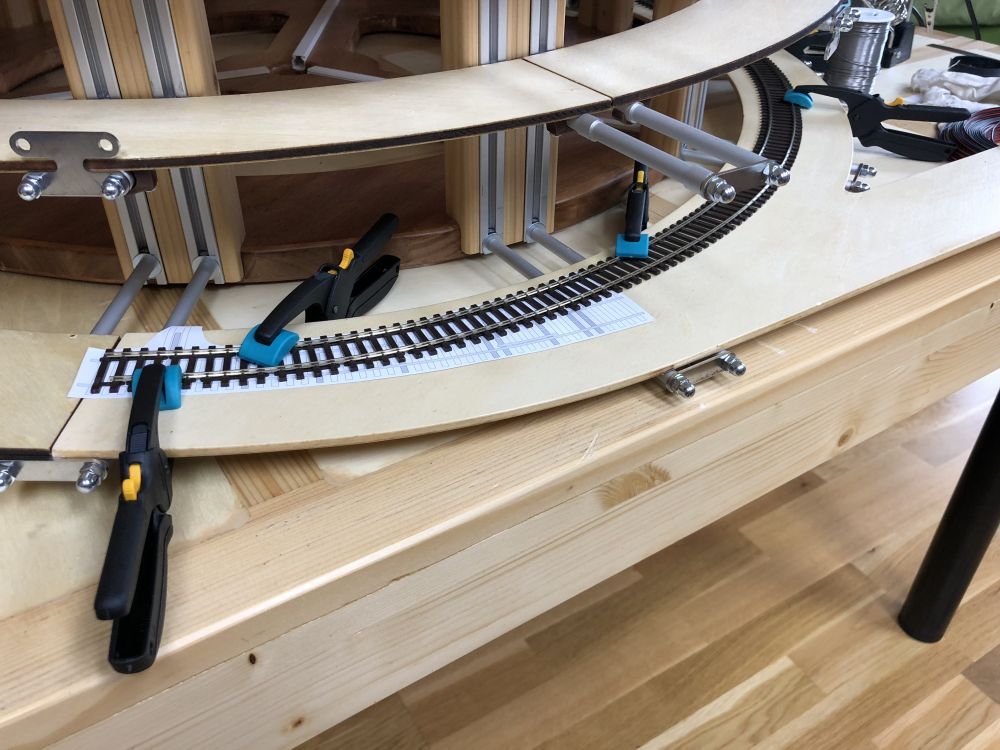 Le 4 juin, en attendant que les éléments du boîtier soient secs, je prépare la construction de l'aiguille du bas avec une copie à l'échelle 1 d'une aiguille en courbe #6 de Fast-Tracks. La courbe est particulière et il n'y a pas un rayon mais une succession de courbes. Ce tracé va me permettre de commencer à coller le liège.