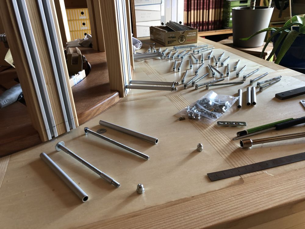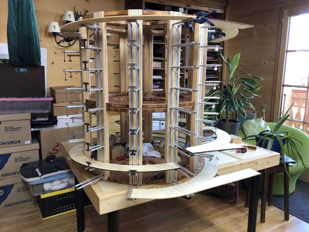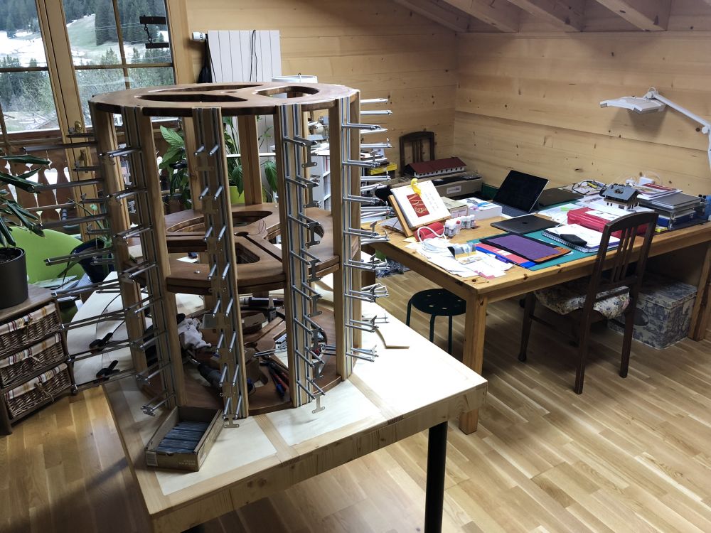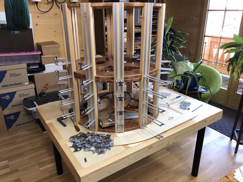 Le 25 avril 2018, commencement du montage des chemins de roulement. Mise en place du centre de l’hélicoïde sur la table et traçage du premier tour. Je colle les écrous coulissants “item24” en bout des tiges filetées avec une goutte de Loctite bleue.