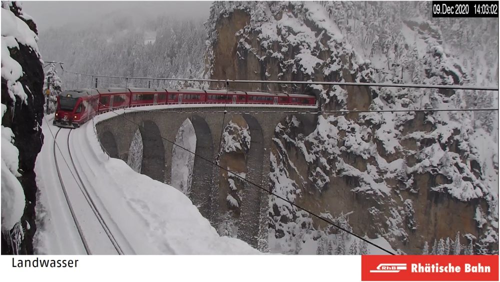 Je regarde de temps en temps un lien de caméras en ligne de RhB et voici le passage du train sortant du tunnel sur le viaduc de Landwasser.